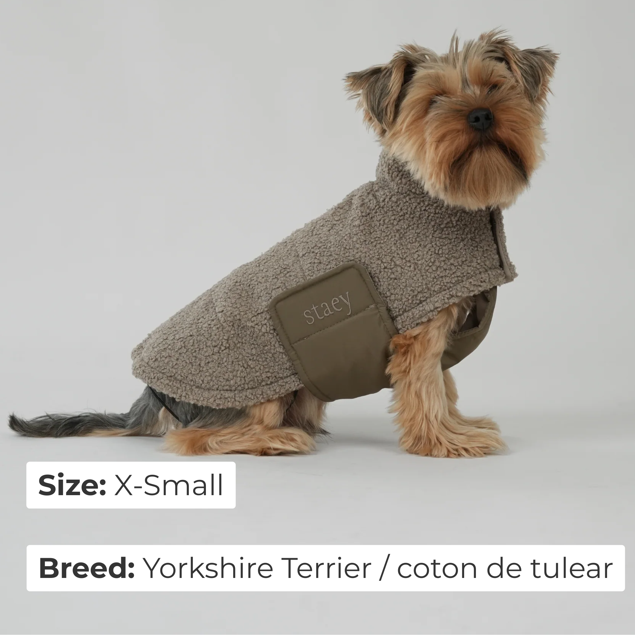We started with teddy fabric – not just for the look, but for the softness. The jacket is unlined to keep it lightweight, and the belly panel is made from an easy-wipe fabric because, well… dogs will be dogs.